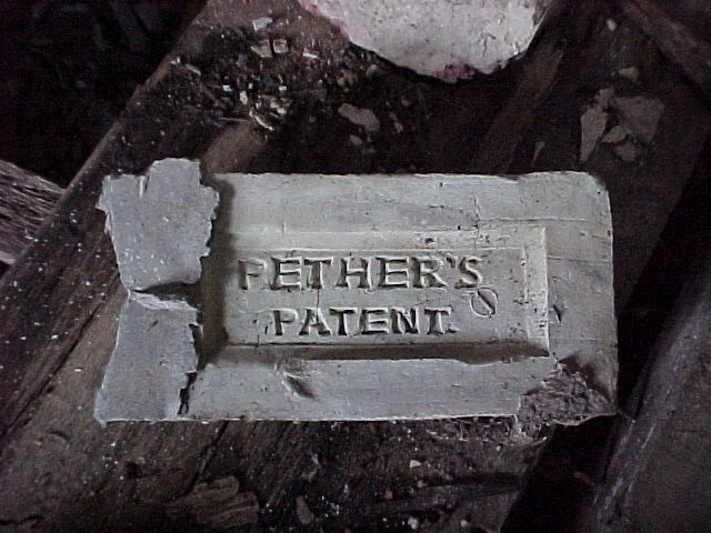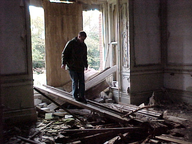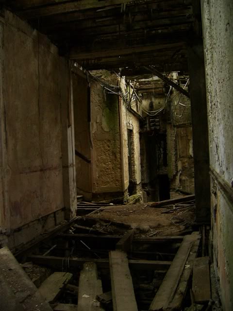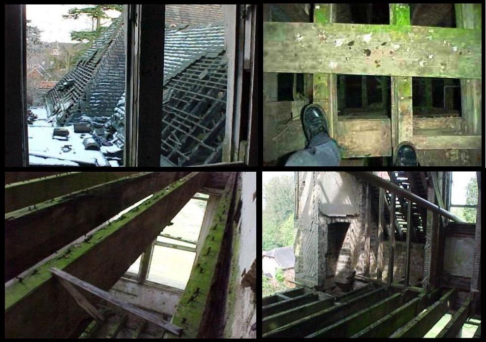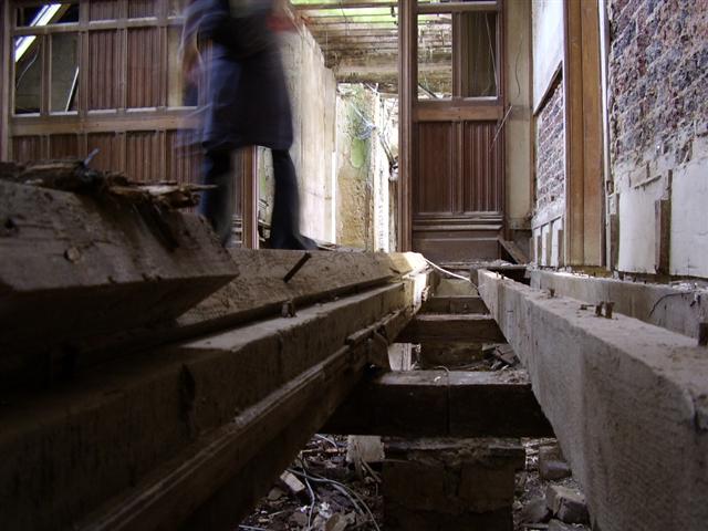Climbing up a bank of slate shelves we find ourselves in the main corridor, stripped of floorboards. From here onwards, the only way to get around is by balancing precariously on the joists, which are about 3 inches wide and full of protruding nails. A side passage with a tiled floor leads to the back door and opposite is a flight of servants' stairs, (we'll come back to them later). On the same side of the corridor is the grand staircase, now destroyed by the collapse of the upper front hall and opposite leading off the corridor is the drawing room. At the end of the corridor and running around the main entrance is a carved wooden screen evidently inspired by the parclose or rood screens found in many mediæval churches.