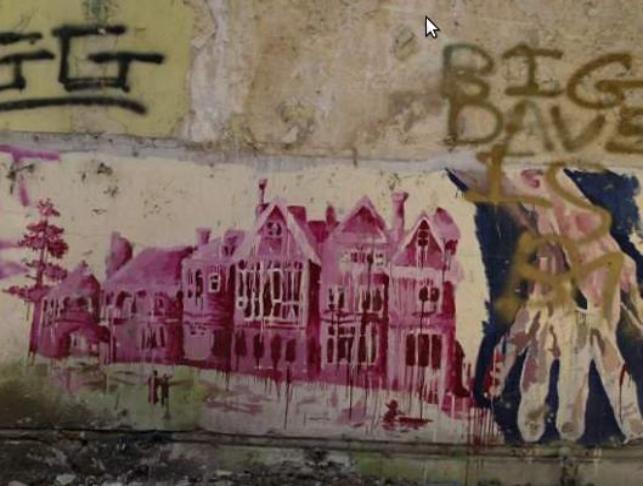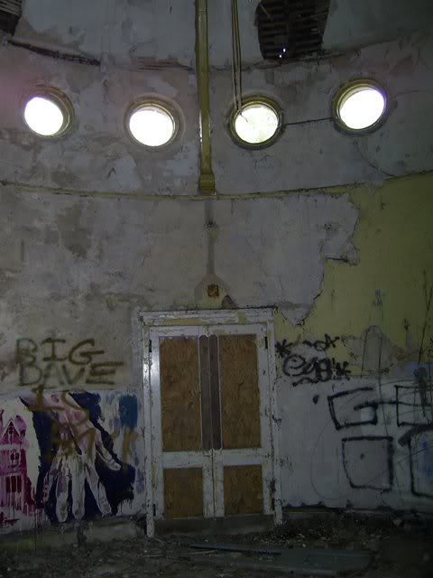 the round room probably originated as a game room but was used as a dining room by the instute. Photographs from the 1950s show a mural of nineteenth century town scenes painted between the picture rail and the upper windows; this has long gone but two interesting murals have been painted here since the place was abandoned, one showing Beedingwood as it looked prior to the collapse of the upper front room.