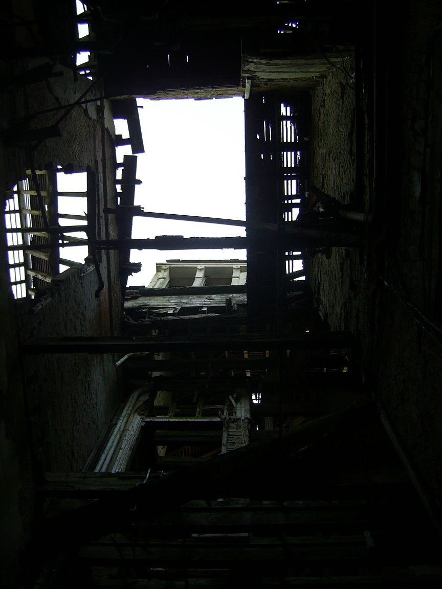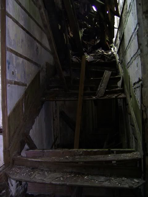 The first floor would have been occupied by the family's bedrooms, bathroom and so-on, but most are inaccessible to us because there is a large hole in the floor in front of us. Climbing more stairs we reach the attic, originally used for storage and as servants' quarters, hence it is only accessible via the servants' stair. At this point we perch some thirty feet above the hard concrete floor below.