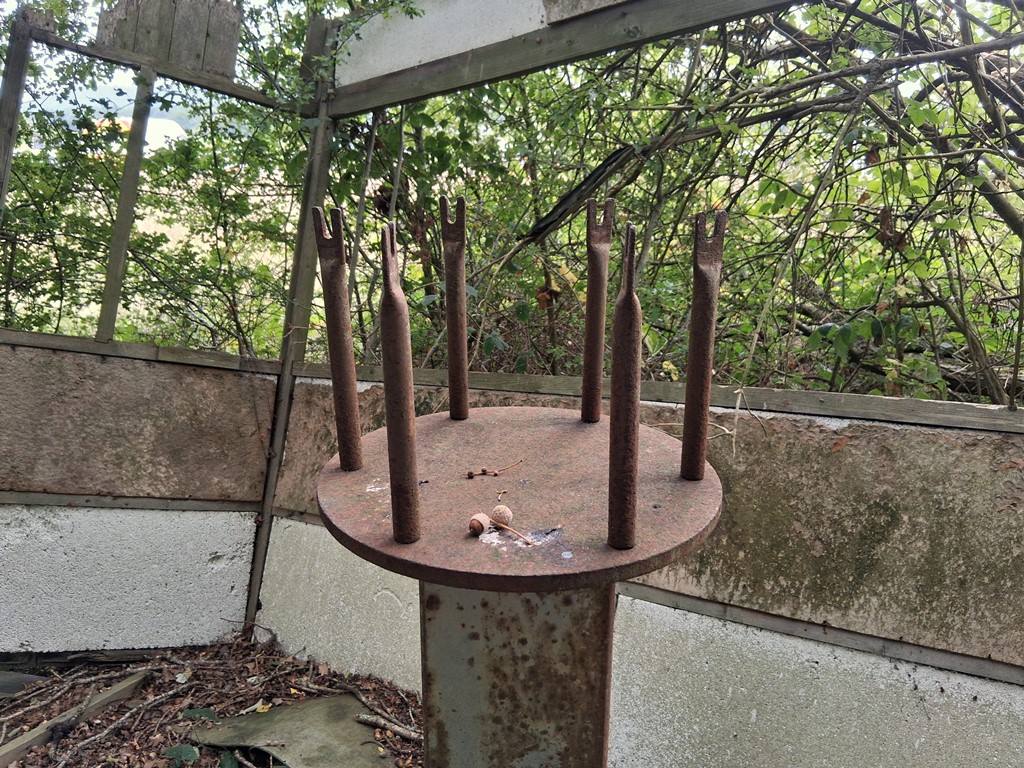 Fixed camera/instrument mount from Hawker/BAe days, hidden in trees to the south of the main runway. The hut in which it was housed has completely collapsed.
