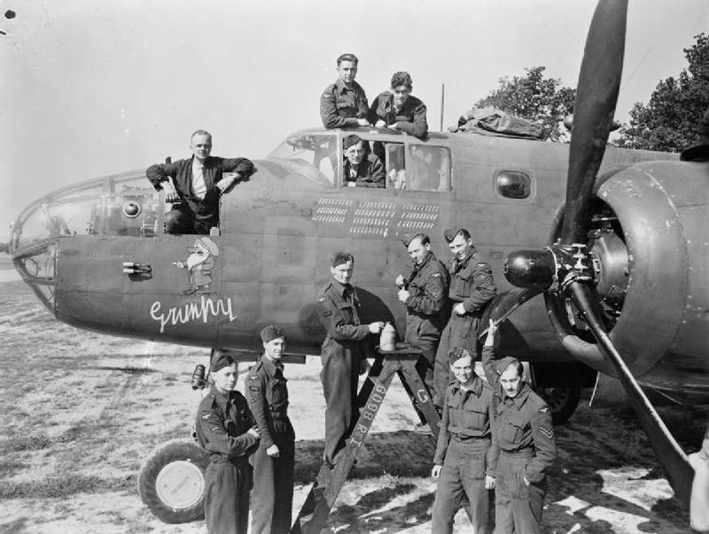 Ground staff of 98 Squadron RAF, with Mitchell Mk II, FL176, 'VO-B' "Grumpy", 14 August 1944. (Imperial War Museum).